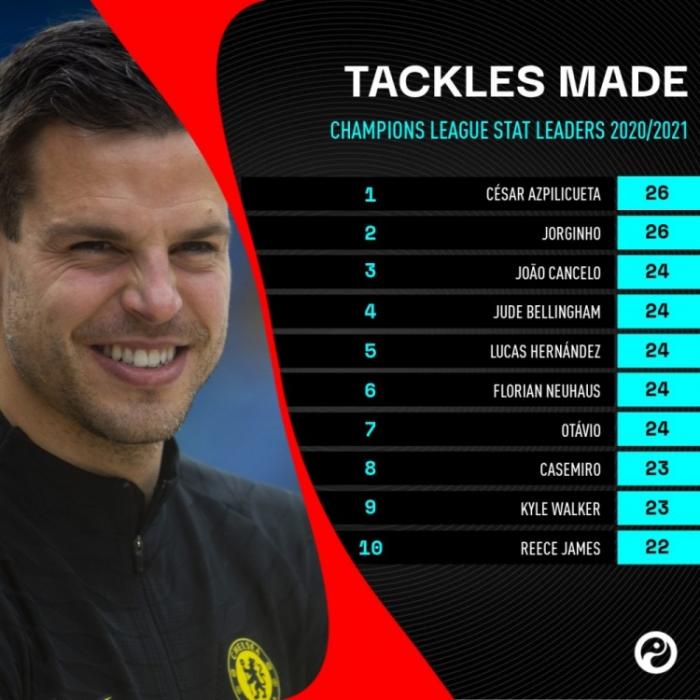 抢断榜:阿兹皮利奎塔和若日尼奥都有26次抢断并列第一,随后是坎塞洛、贝林厄姆、卢卡斯、诺伊豪斯、奥塔维奥的24次,卡塞米罗、沃克的23次,最后是里斯詹姆斯的22次。可以看出,切尔西在中后场的抢断和拦截真的非常出色,这也是他们拿到欧冠冠军的重要法宝。