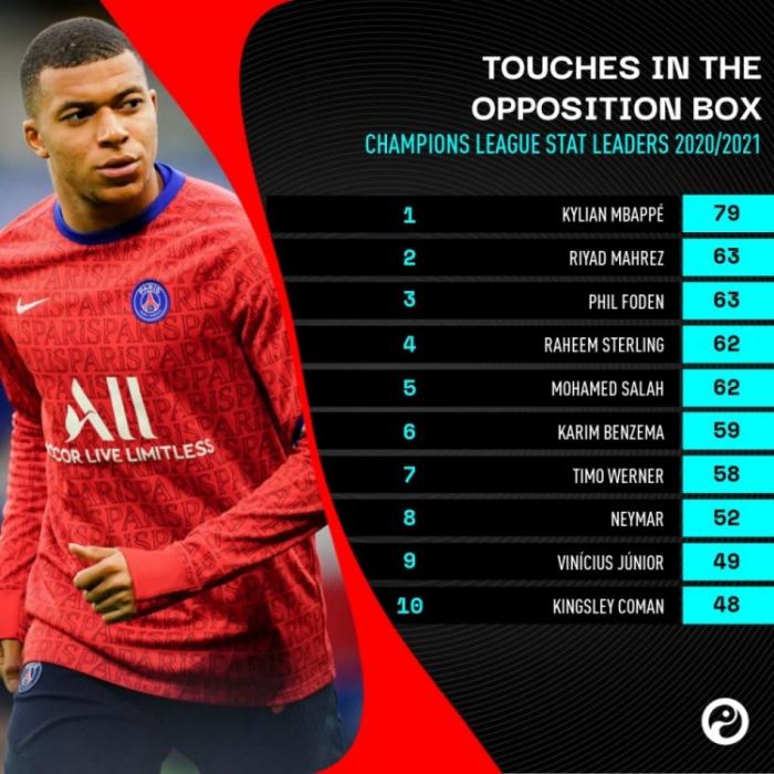 对方禁区触球榜:姆巴佩79次位居榜首,其次是马赫雷斯和福登的63次,斯特林和萨拉赫的62次,本泽马的59次,维尔纳的58次,内马尔的52次,维尼休斯的49次,科曼的48次。不得不说,姆巴佩的表现真的好,射手榜第二,助攻榜第五,创造机会榜第一,过人榜第一,这些都说明了为啥姆巴佩值2亿欧元。