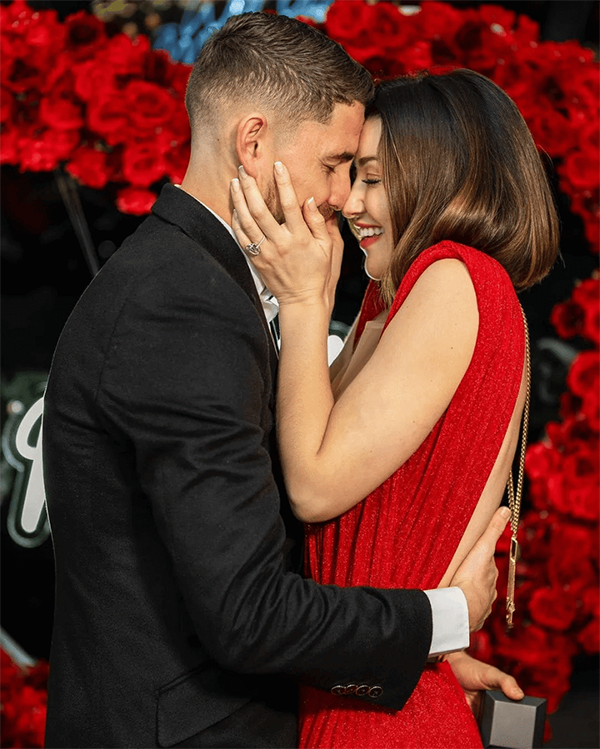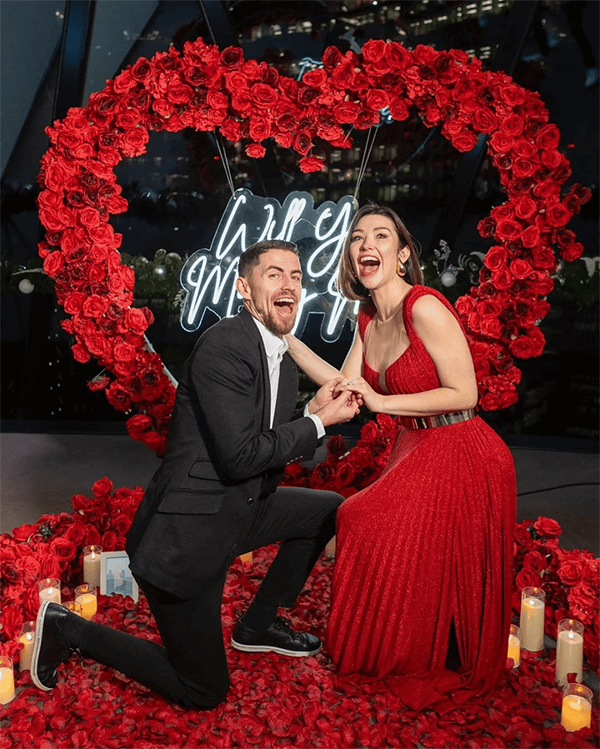 照片中,若日尼奥身着黑色西装,挺拔帅气。这位意大利国脚单膝跪在摆满玫瑰、蜡烛和灯光的心形标志前,上面写着:你愿意嫁给我吗?而他的爱人凯瑟琳则身着一袭红裙惊艳全场。求婚成功后,两人更是深情热拥,并且一边品尝香槟一边翩翩起舞,可谓幸福感满满。