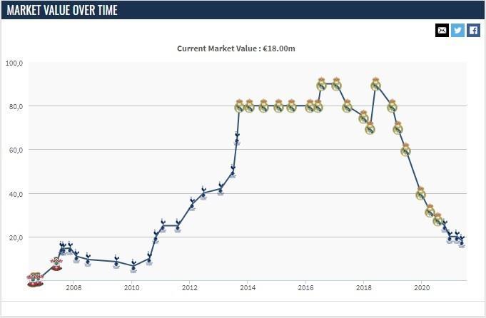 其中31岁的贝尔的身价由2000万欧降至1800万欧,下降了10%。