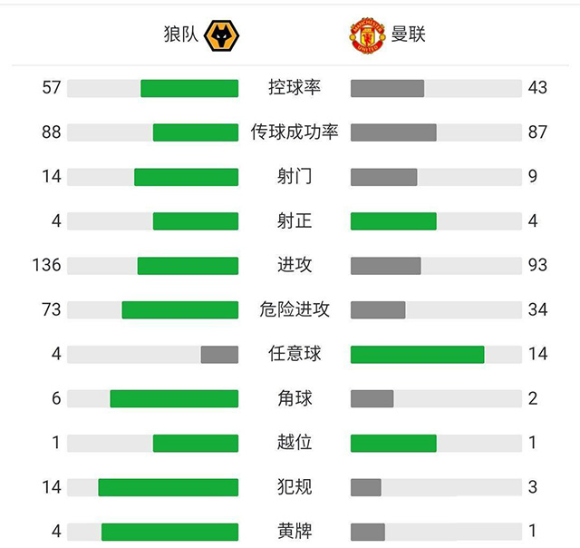 补时阶段,怀特禁区外一脚冷射,稍稍打偏。最终全场比赛结束,曼联2-1战胜狼队!