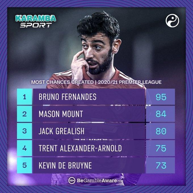 24直播网讯 北京时间5月21日,本赛季英超即将结束。据Squawka统计,本赛季英超球员中创造机会最多的是曼联的B费,高达95次。芒特、格拉利什分居第二第三。