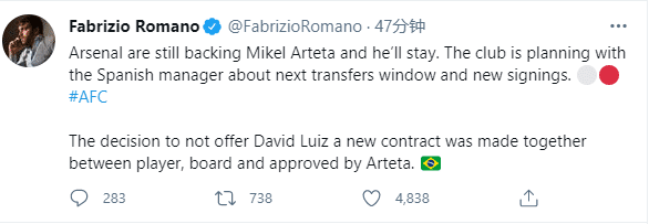 此外,大卫-路易斯和董事会一起决定不续约,这也得到了阿尔特塔的批准。
