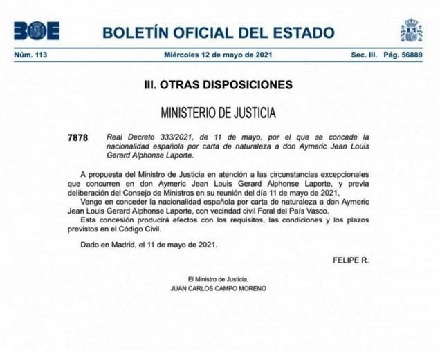 24直播网讯 北京时间5月12日,来自西班牙国家政府公报(BOE)的消息,根据2021年第333号法令,效力于曼城的巨星中卫拉波尔特,正式被授予西班牙国籍,届时有望代表斗牛士军团出战欧洲杯。