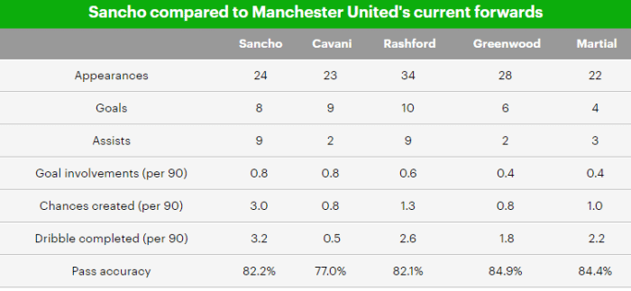 对比桑乔与曼联前锋的联赛数据,只有卡瓦尼的进球效率超过他,而桑乔的助攻数字与拉什福德相同,比卡大佐、梅森·格林伍德和马夏尔相加更多。