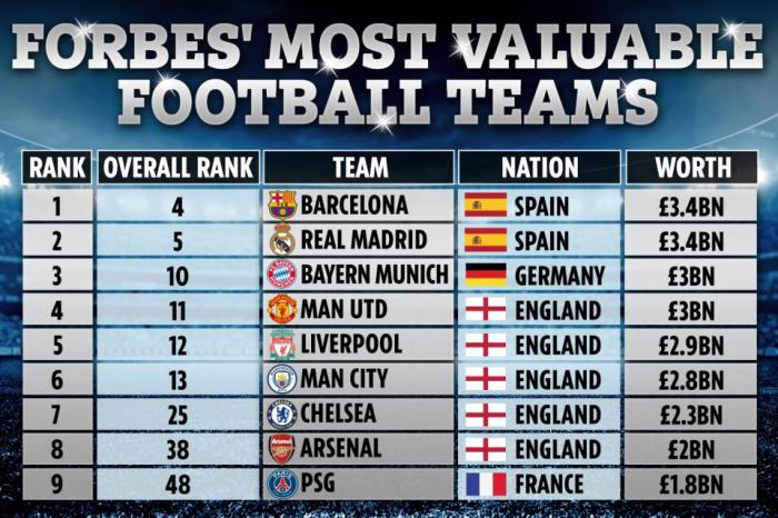 曼联与拜仁慕尼黑的估值都在30亿镑上下,稍微领先于利物浦(29亿镑)和曼城(28亿镑)。切尔西则以23亿镑排名第七。