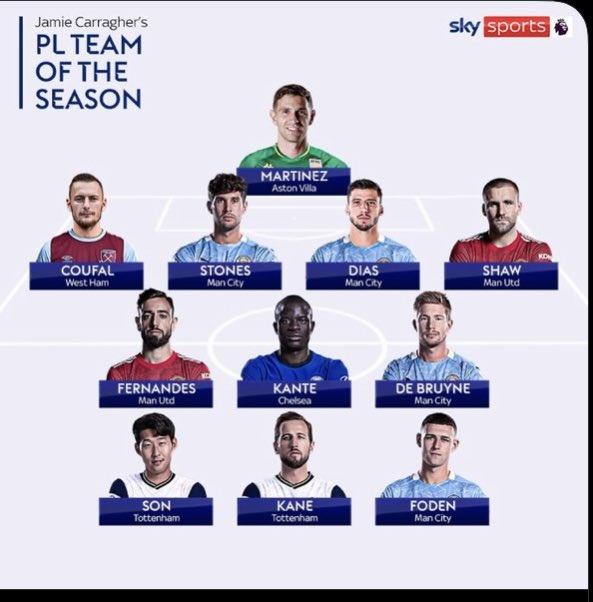 后卫:库法尔(西汉姆),斯通斯(曼城),迪亚斯(曼城),卢克-肖(曼联)
