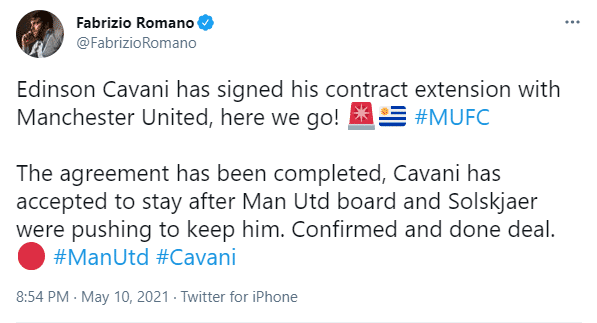 据悉,罗马诺称,卡瓦尼已经同意留队了,和
