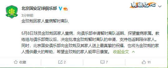 球员金玟哉因家人重病,向俱乐部申请暂时离队返韩,探望重病家属。教练组与俱乐部商议后,决定批准金玟哉暂时离队的申请,支持他返韩陪伴家人。同时,北京国安俱乐部向金玟哉及其家人送上最真挚的祝福,也将为金玟哉的家人提供最大的帮助,希望金玟哉的家人能早日康复。