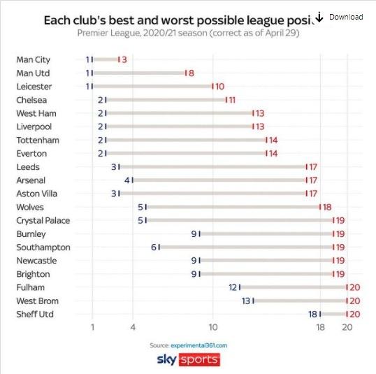 这里要说一下,天空体育给出的是各大球队理论上的数据。其中曼城本赛季的成绩肯定在第1到第3之间,而他们也是目前英超赛场上唯一一支锁定前四的球队。而第二的曼联,他们的排名会在第1到第8之间,也就是说在理论上,曼联还有可能掉出前四,当然除非最后五轮比赛曼联四连败或者五连败,不过可能性很小。第三的莱斯特城的排名会在第1到第10之间,也就是说莱斯特城目前的排名也不稳,而且莱斯特城后面可是有一段小魔鬼赛程哦。
