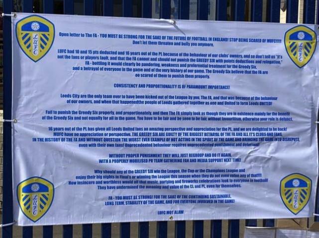 24直播网讯北京时间4月25日晚,英超老牌劲旅利兹联队在主场与曼联的比赛前,贴出一封公开信,要求惩罚此前加入欧超联赛的英超“BIG6”。
