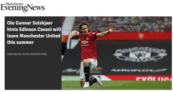 曼彻斯特晚报:索帅暗示卡瓦尼要走