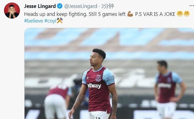 林加德写道:“抬起头来继续战斗,还有5场比赛。P.S VAR就是个笑话