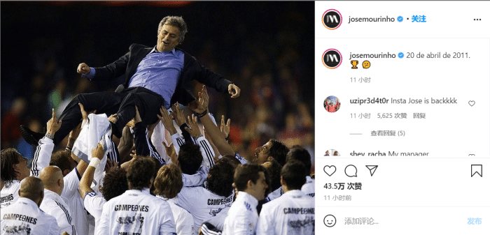 穆里尼奥离队的时候就表示,他很快就会回来,他不需要休息。而不少人都猜测他的下家,而近日穆里尼奥发布了INS,也引起了球迷的猜测。穆里尼奥在社交媒体上晒出了带领皇马夺得国王杯的照片,而且配文:“2011年4月20日。”穆里尼奥什么都没说,但是已经有媒体传闻穆里尼奥希望回归皇马了,当然穆里尼奥能否回归皇马不知道,但是他和老佛爷的关系真的不错,说不定真有这种可能性。
