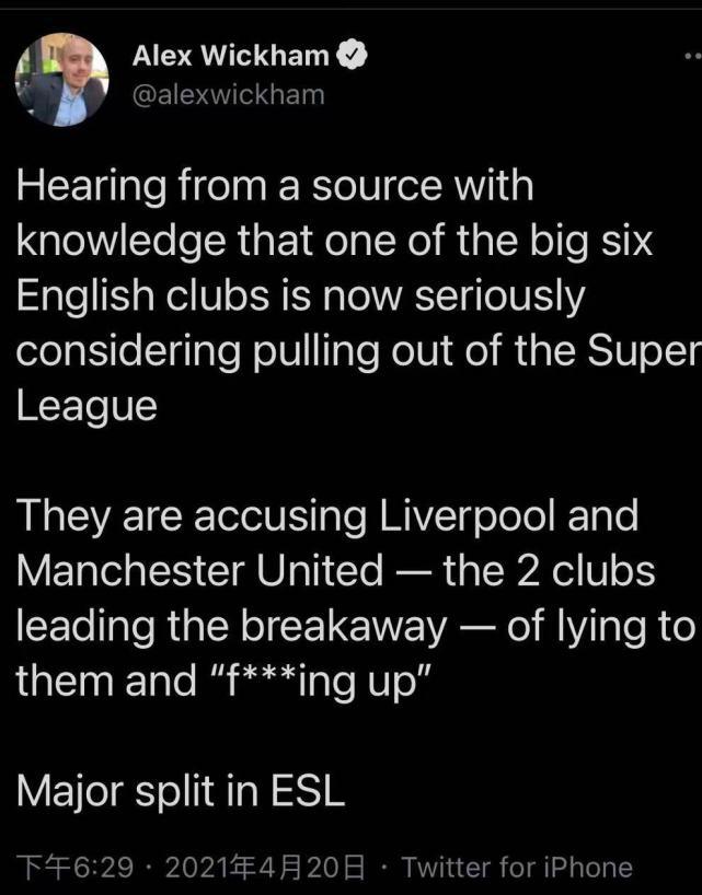 这家俱乐部甚至还指责利物浦和曼联这两家引导成立欧超联赛建立的牵头俱乐部是“骗子”,直言自己被这两队所欺骗,这家俱乐部管理层甚至还爆了粗口。而Alex Wickham的这则消息,也得到了泰晤士报主编Martyn Ziegler的证实。这家俱乐部考虑退出欧超的很重要原因,是担心来自球迷的反对声音。该俱乐部正在就如何才能得到最好的未来愿景,进行紧急的磋商。
