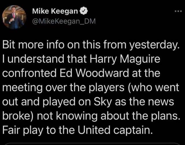 北京时间4月20日晚,来自《每日邮报》曼联跟队记者Mike Keegan在个人社交账号上的透露,在曼联谈论欧超联赛的内部会议中,曼联队长马奎尔和曼联高层伍德沃德发生了争执。