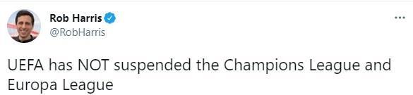 哈里斯写道:“欧足联没有暂停欧冠与欧联杯赛事。”