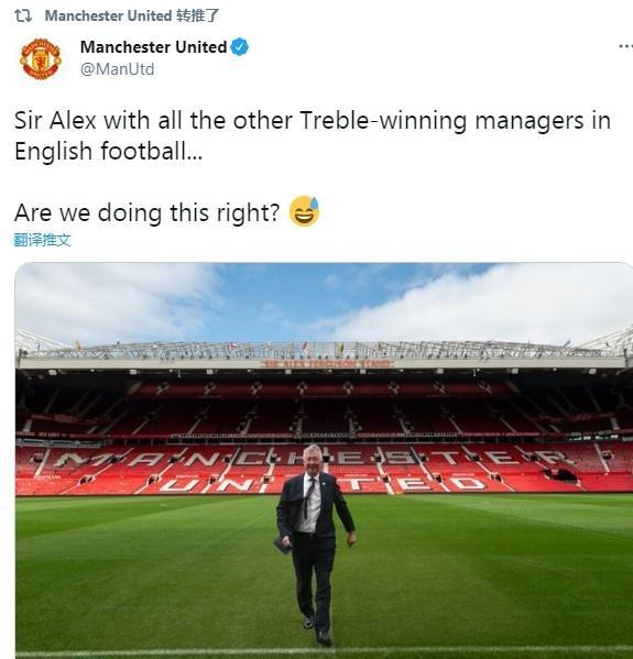 这则推文发布了弗格森一人站在梦剧场的照片,配文写道:“弗爵和其他英格兰足坛的三冠教练。”