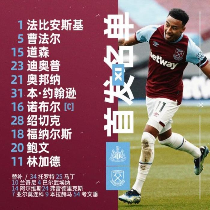 西汉姆首发:1-法比安斯基、5-库法尔、15-道森、21-奥邦纳、23-迪奥普、16-诺布尔、31-本-约翰逊、28-绍切克、18-福纳尔斯、11-林加德、20-贾罗德-鲍文