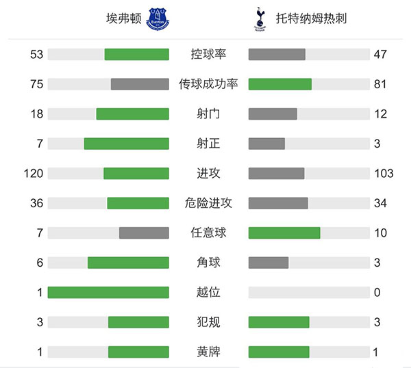 全场比赛结束,热刺客场2-2战平埃弗顿。