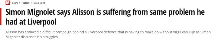 “阿利松表现有下滑存在几个原因,一方面他自身有一些伤病,另一方面是利物浦几乎整个赛季都缺少范迪克。”