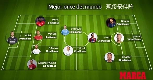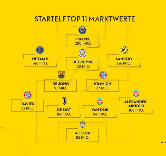 上图是此前德国《天空体育》综合球员德转的身价给出的最贵阵容: