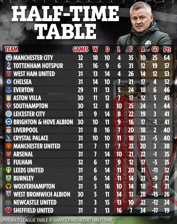 这也充分体现了曼城目前排在英超榜首的合理性,因为无论上下半场,他们均保持同等水平。西汉姆、切尔西和埃弗顿,也是能够保证全场比赛水平一致的球队。