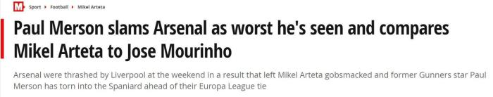 默森说:“几天前对利物浦,是我见过的最差的阿森纳。我不记得此前还有过这么差的阿森纳,有人会说埃梅里时期,或者温格末期,但我认为那两个时候都没有现在这么差。现在阿森纳似乎只会回传门将,然后门将大脚把球开出。”