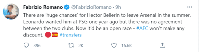 罗马诺表示:“贝莱林很可能在今夏离开阿森纳,莱昂纳多一年前想将他带到巴黎,但两支俱乐部没有达成协议。现在贝莱林的追逐战是公开的,但阿森纳不会降价卖人。”