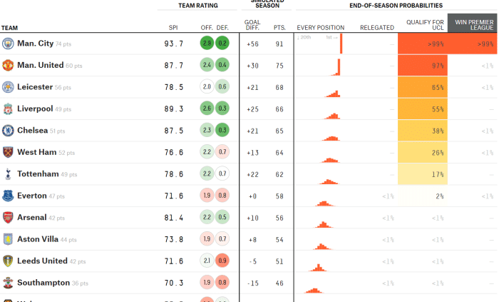 上面就是“538”给出的英超各大球队争四的几率,不知道您认为谁能最终在赛季末进入英超前四呢?而目前来看,其实两支黑马球队西汉姆和埃弗顿的几率还是挺大的,他们阵容实力不错,最主要的是他们的球员没什么压力了,这种情况下,球队的表现往往会更好。说不定,本赛季结束的时候,埃弗顿和西汉姆最终有一支球队能够进入英超前四也不一定!