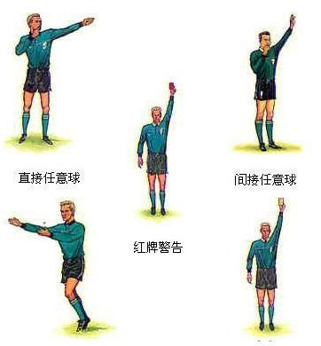 界外球手势是身体面向边线球出界的地方,五指合拢胳膊抬起呈45度角,直接任意球是要求裁判员五指合拢单臂侧平举向上45度,间接任意球是直接任意球一样,首先明确进攻方向,门球时要求裁判员面向球门五指合拢单臂平直向前举,角球角球时裁判应面向底线,手指向球出底线一侧的角球区,进攻有利的信号是既要有视觉信号也要有声音信号,双臂前举,手臂向前稍作连续挥动。