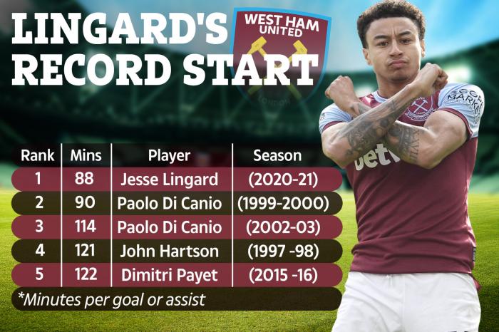 24直播网讯自从1月份离开曼联,加盟西汉姆后,大英帝星林加德表现优异,创造了球队的新纪录。数据显示,林皇平均88分钟就能打入一球或者助攻1次,超越名宿迪卡尼奥的20年前的数据,创造队史新纪录。