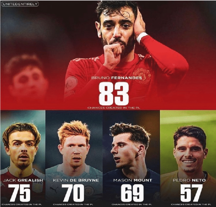24直播网讯一个好的中场,对球队来说非常重要,因为一个优秀的中场球员,不仅可以掌控比赛的节奏,还能够帮助球队创造很多机会,那么本赛季英超赛场上,哪些中场球员制造机会的能力最强呢?近日,英格兰媒体就盘点了本赛季英超制造机会的榜单,其中曼联队内的葡萄牙中场B费制造机会的次数最多,而维拉队内的格拉利什排名第二,曼城队内的德布劳内排名第三。