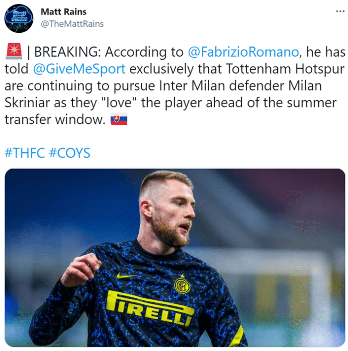 热刺此前曾与什克里尼亚尔传出过绯闻,罗马诺表示这位国米后卫现在依然是热刺的目标,他称穆里尼奥非常欣赏什克里尼亚尔,而热刺也相信这名球员是一个完美的引援对象,国际米兰方面则希望得到7500万欧元的转会费,