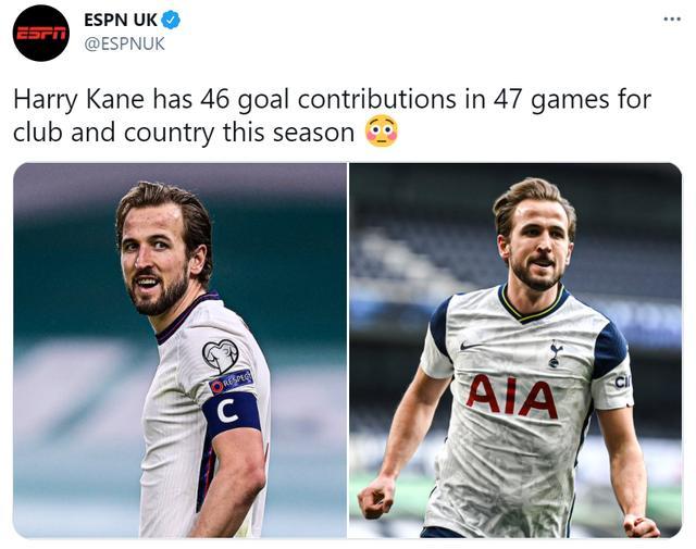 24直播网2月29日讯据ESPN统计,凯恩本赛季47场俱乐部和国家队比赛共造了46球,场均创造近1球。