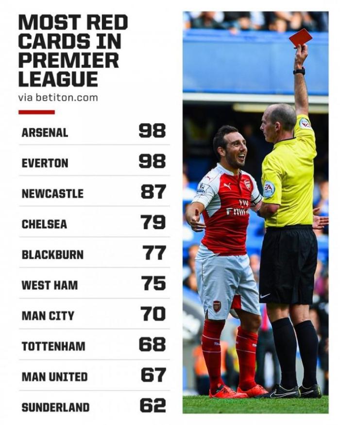 24直播网讯北京时间3月27日,外媒统计英超历史红牌榜TOP10,阿森纳和埃弗顿98次染红并列第一,英超BIG6中除利物浦外全部上榜。
