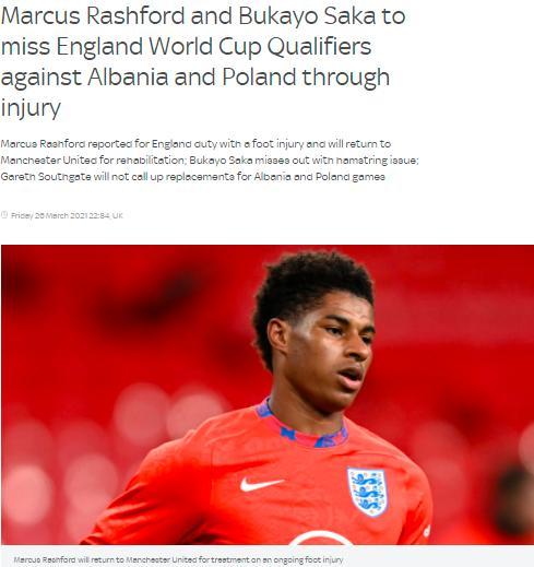 在英格兰5-0击败圣马力诺的比赛中,拉什福德和萨卡就都没有出战。接下来,他们还将错过对阵阿尔巴尼亚和波兰的比赛。
