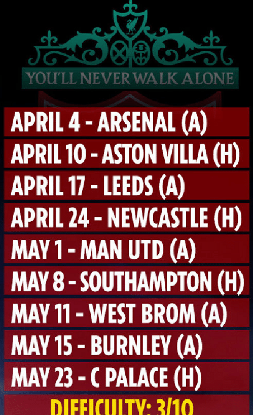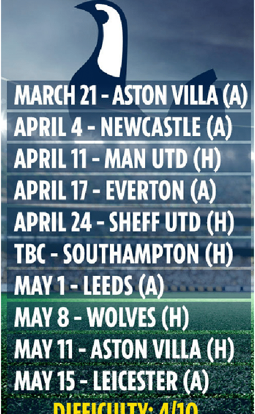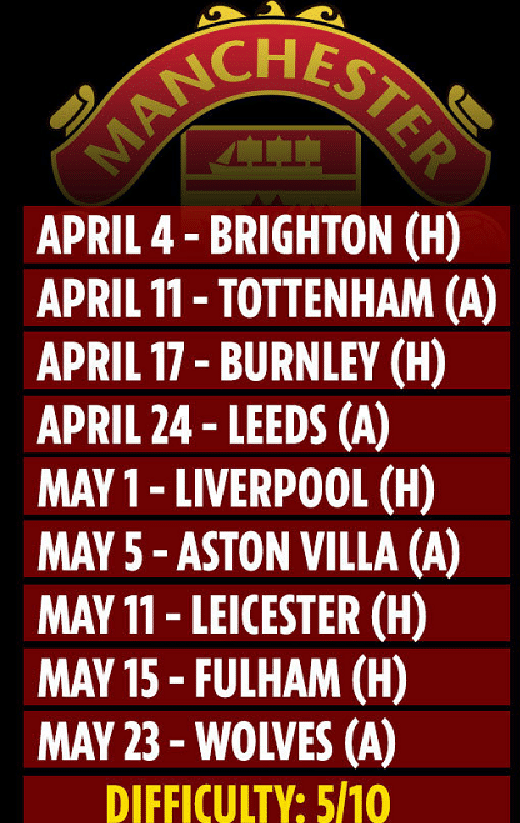 最后说一下热刺,热刺还有十场比赛要踢,球队要主场对阵南安普顿、曼联、谢菲联、狼队和维拉。而且要客场对阵维拉、纽卡、埃弗顿、利兹联和莱斯特城。老实说,热刺这个赛程,个人感觉很差啊,这里面埃弗顿、曼联、狼队、莱斯特城实力都不差。不知道这个4分的评分是什么标准。个人感觉热刺的赛程至少也是6分的难度了。