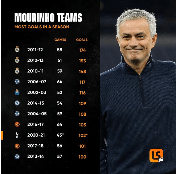 如图,上图是穆里尼奥执教各赛季进球数排名前十的赛季,其中11-12赛季他执教的皇马各项赛事58场比赛打进174球,场均进球刚好是3球。所有球迷都知道,皇马那个赛季联赛121球是欧洲纪录,但是你不知道的是··,那个赛季· 皇马各项赛事·打进174球也是五大联赛纪录,即便是18-19赛季,火力强大的曼城各项赛事也不过打进158球,远不及皇马。