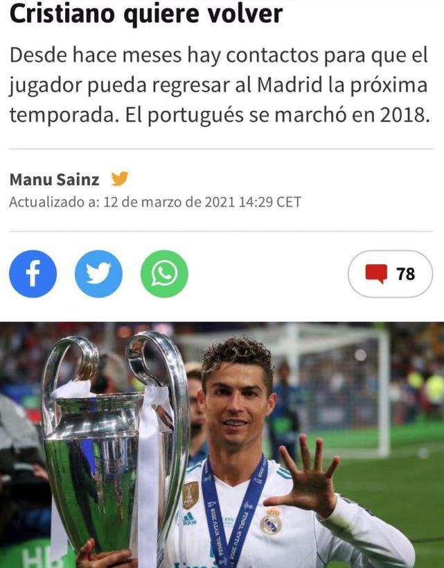 24直播网3月13日讯 在连续三个赛季跟随尤文折戟欧冠之后,葡萄牙巨星C罗今夏是否会与尤文分道扬镳,以及他的下一站去哪,无疑是外界关注的焦点。而北京时间3月12日晚,来自西班牙媒体《阿斯报》的知名记者Manu Sainz的消息,C罗对于回归老东家皇马的意愿十分强烈,双方甚至已经有了数月的接触。