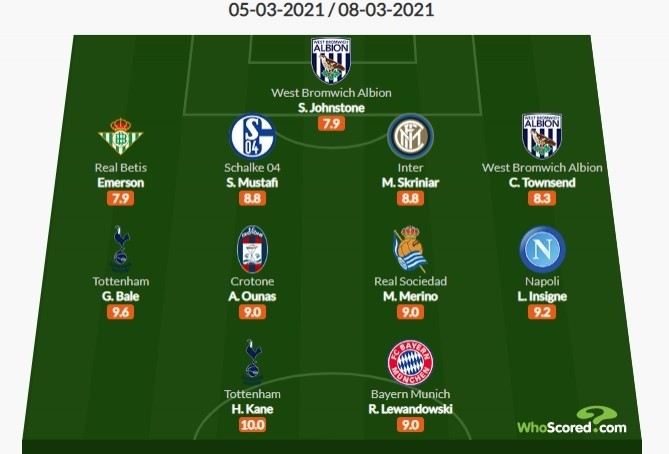 24直播网讯 北京时间3月9日讯欧洲五大联赛结束了新一轮的争夺,著名数据网站《Whoscored》也评选出了周最佳阵,凯恩、莱万领衔,贝尔、穆斯塔菲在列。
