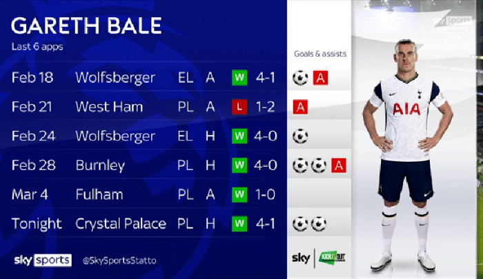 本场比赛结束之后,《天空体育》统计了贝尔近期的情况,贝尔最近出场的6场比赛,打进了6球助攻了3次。其中,热刺4比1沃尔夫斯贝格的比赛,贝尔1球1助攻,热刺1比2西汉姆的比赛中,贝尔贡献1次助攻。热刺4比0沃尔夫斯贝格的比赛,贝尔打进1球。热刺4比0伯恩利的比赛中,贝尔2球1助攻。本场比赛贝尔打进2球,最近六场比赛只有0比1不敌富勒姆的比赛中,贝尔没有任何斩获。