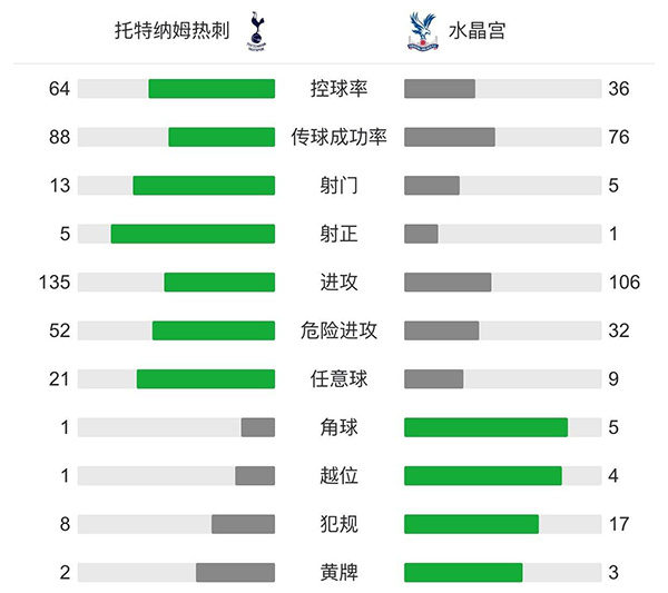 全场比赛结束,热刺主场4-1击败水晶宫,球队在各项赛事迎来四连胜。