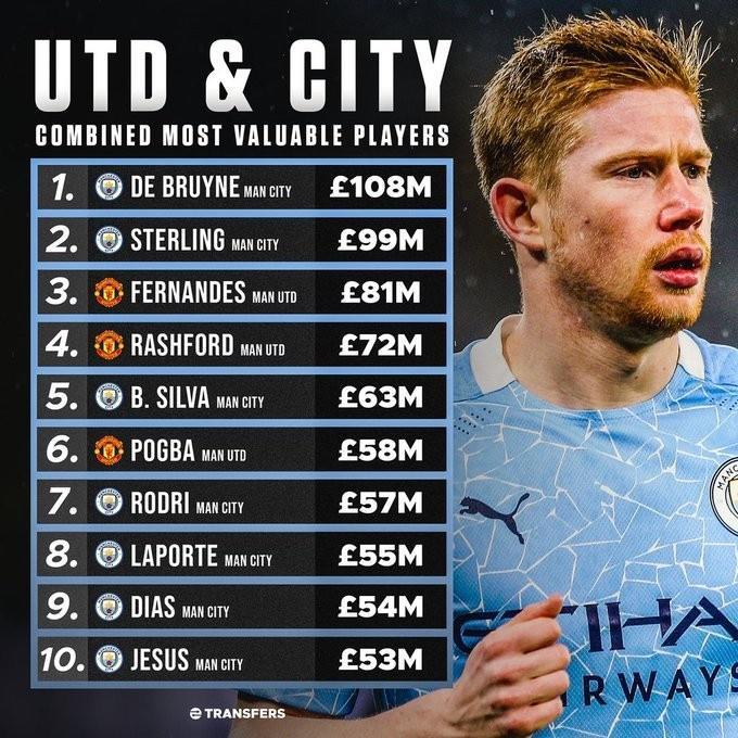 24直播网3月7日讯北京时间3月8日凌晨,英超第27轮迎来曼市德比。推特主“Football Transfers”盘点了双方阵中身价最高的10位球员,其中曼城7人入选,曼联3将上榜。德布劳内身价1.08亿镑居首,斯特林9900万镑次席,B费8100万镑排第三。