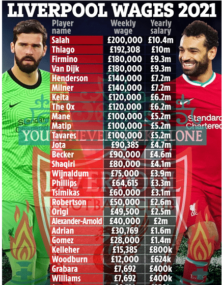 其中,若塔的周薪是9.03万英镑,阿利松的9万英镑,沙奇里的8万英镑,维纳尔杜姆的7.5万英镑,菲利普斯的6.4万英镑,齐米卡斯的5万英镑周薪。而其中,利物浦主力边后卫罗伯逊的周薪是5万英镑,阿诺德的是周薪是4万英镑,而戈麦斯的周薪是2.8万英镑。当然,这些都是不算奖金的基本工资。也难怪阿诺德、罗伯逊等人疯狂插上助攻,不进球,不助攻,工资实在太少。