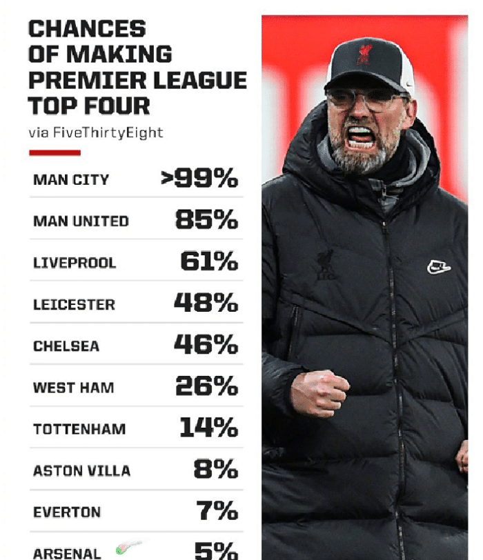 如图,曼城进入前四的几率是99%,当然曼城只是理论上可能跌出前四,毕竟目前英超还有13轮比赛,而曼城只是比第五的切尔西多出了18分,理论上曼城还有可能跌出前四,不过实际上这种情况几乎不可能发生。而第二的是曼联,他们争四的几率是85%,毕竟目前曼联高居联赛第二,球队比第五的切尔西高出了6分,争四的希望是非常大的。