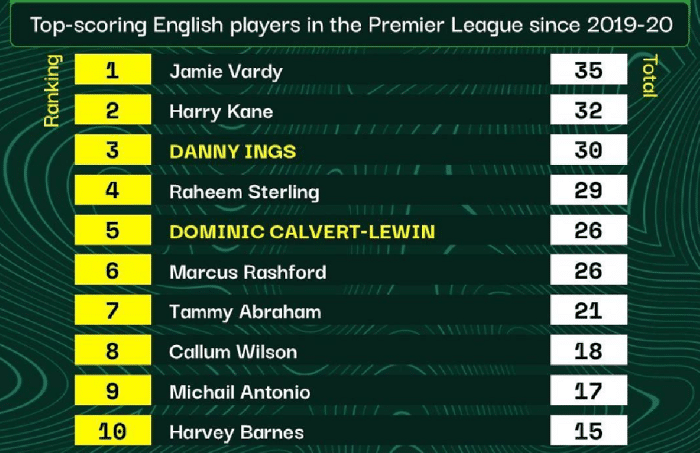 而排名第三的是丹尼因斯,他在同期打进30球,跟着是斯特林的29球,勒温和拉什福德的26球,亚伯拉罕的21球,威尔逊的18球,安东尼奥的17球和巴恩斯的15球。而其他球员方面,萨拉赫同期打进36球,马内同期打进25球,B费同期打进23球,孙兴慜同期打进24球,奥巴梅杨同期打进30球。需要说一下的是,阿奎罗因为本赛季受伤严重,所以还没有在联赛进过球,上赛季阿奎罗在联赛打进16球。