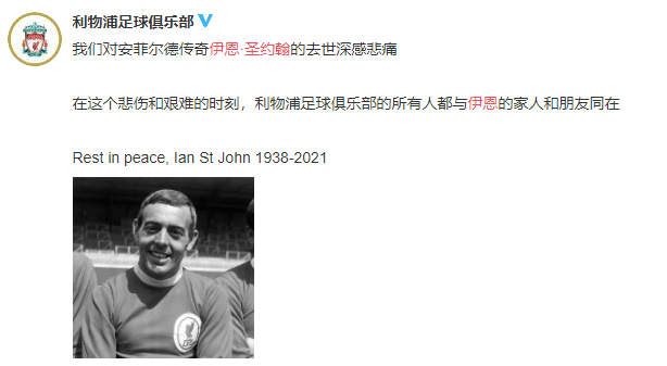 我们对安菲尔德传奇伊恩-圣约翰的去世深感悲痛,在这个悲伤和艰难的时刻,利物浦足球俱乐部的所有人都与伊恩的家人和朋友同在;Rest in peace, Ian St John 1938-2021