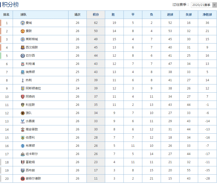 24直播网3月2日讯 2020-21赛季英格兰超级联赛第26轮的比赛结束了,本轮比赛,曼联和切尔西打平了,而曼城则取得了各项赛事的20联赛,而曼城领先第二名曼联的优势也扩大到了12分,可以说他们夺冠在望了。而利物浦和热刺在连败之后,也相继赢球了,他们似乎也开始为争四发力了。而后面的英超比赛,可能会更加精彩了,而英超争四大戏,正式上演。