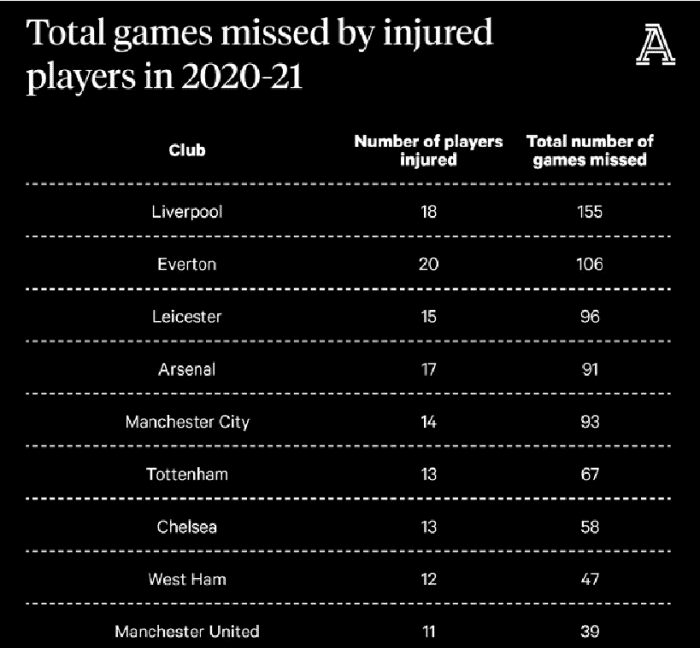 如图,利物浦本赛季有18人受过伤,他们总共错过了155场比赛,而且利物浦受伤的球员基本上都是核心球员,范迪克、戈麦斯、蒂亚戈、法比尼奥等诸多球员都遭遇了伤病,这对利物浦的影响非常大。而第二的是埃弗顿,本赛季埃弗顿共有20人受过伤,错失了106场比赛。不过,和利物浦相比,埃弗顿的球员没有长期伤病的,而且真正的核心球员都是健康的,他们的情况比利物浦好了不少。